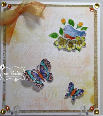It is Wednesday again, and it is my turn to post for OCS. I tried a different technique this time, which I haven't used for years. I embossed the Birds & Blooms Collage Stamp from Heartfelt Creations with white embossing powder, which was then inked with Wild Honey and Dried Marigold Distress Inks. The Bird and Butterflies are both from the Heartfelt Creations Birds and Blooms Collection. The co-ordinating dies were used to cut the bird, flowers and butterflies.
